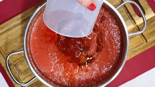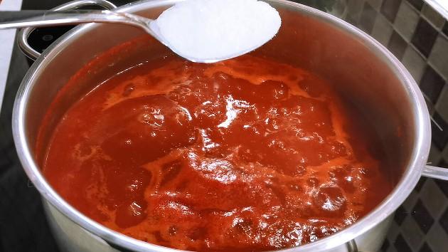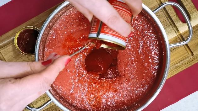 Прокручені помідори і перці перелити в велику каструлю і додати до них томатну пасту. Це той самий інгредієнт, який я обов’язково використовую для отримання найбільш насиченого смаку і кольору аджики. Хтось може порахувати це зайвим, але я на протязі багатьох років переконуюся саме в цьому і дуже раджу спробувати зробити так.