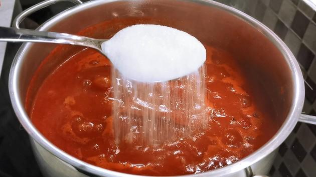Далі поставити каструлю на вогонь, дати суміші закипіти і проварити на середньому вогні 10 хвилин. Після цього додати цукор.