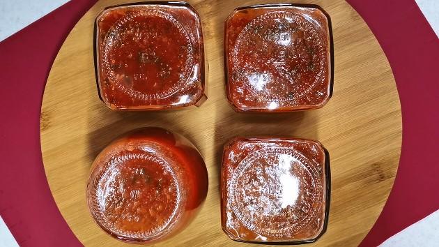 Баночки з кришками обов’язково добре вимити і простерилізувати. Я зазвичай це роблю або стандартним способом над парою, або в мікрохвильовці. Простерилізовані банки наповнити гарячою аджикою і закрити кришками. Якщо кришки без різьби, то просто накрити ними банки, а вже закрутити після подальшої стерилізації.