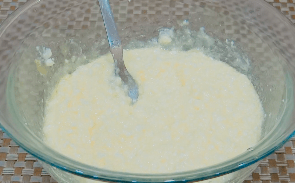 Для тіста до сиру додаємо цукор і ванілін. Якщо сир у вас м’який, то просто розминаємо виделкою. Щільний краще перебити блендером.