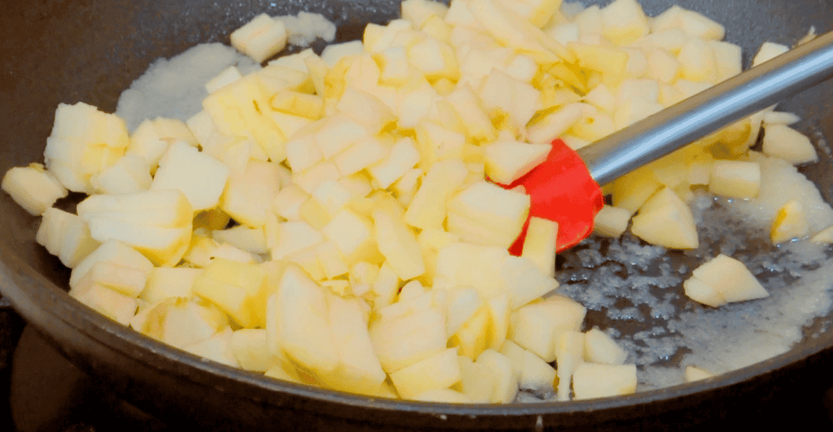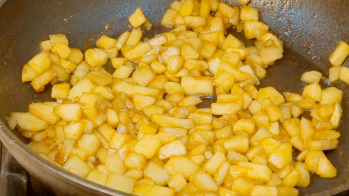 Коли яблучний сік майже випарується додаємо трохи кориці і прожарюємо ще близько хвилини до повної карамелізації.