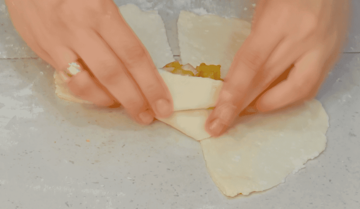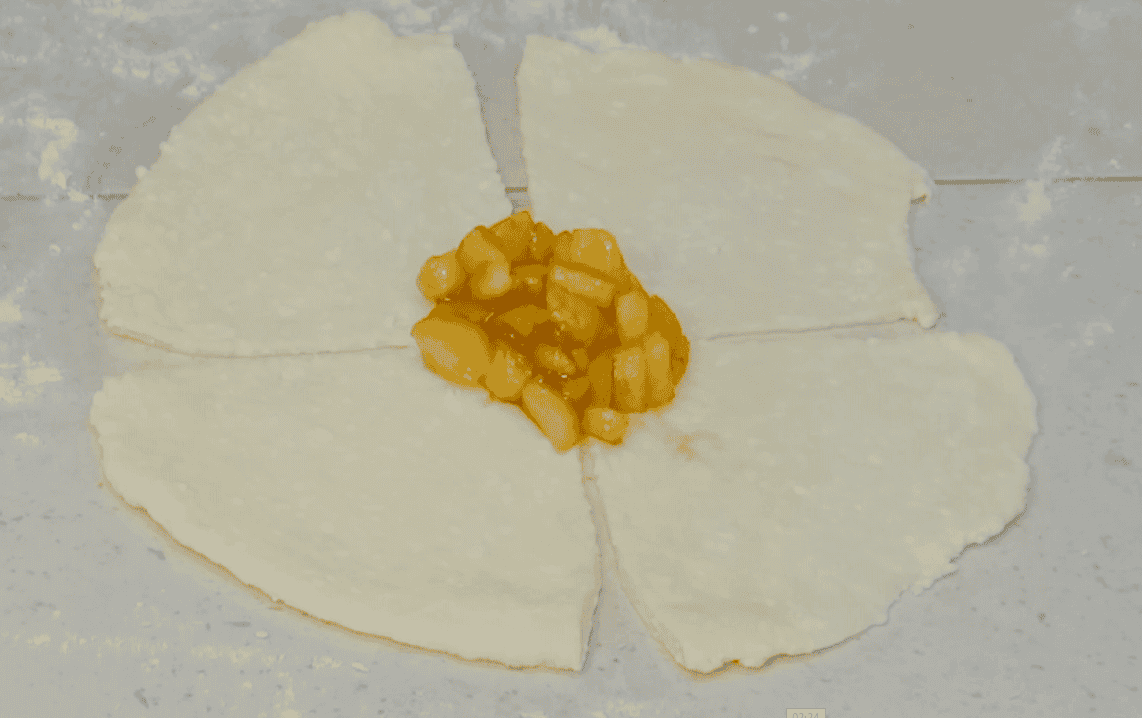 Тісто ділимо на рівні частини. Розкачуємо гурток діаметром приблизно 18 см. Робимо з боків 4 надрізи, залишаючи середину для начинки. Викладаємо невелику кількість начинки в середину кола.