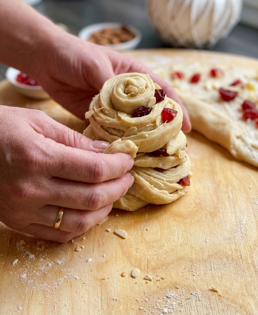 Коли тісто знову виросте у 2 рази, вимісити його і формувати пасочки. Залишити шматок тіста завбільшки з два кулаки на прикраси. Форми застелити пергаментом (змастити його смальцем), зробити високі бортики (мають бути вищі за форму десь на 4 см).