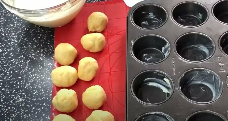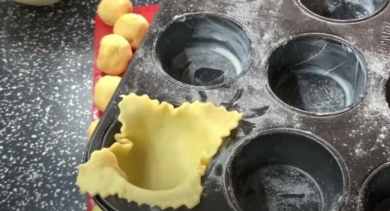 Ділимо тісто на 10 колобків. Формочки для кошиків змащуємо вершковим маслом і посипаємо борошном.