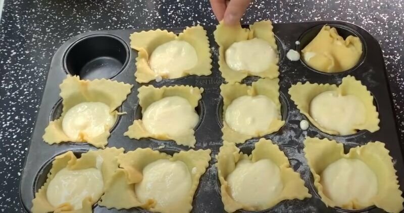 Кожен колобок розкачуємо в невеликий квадратний пласт, який вирівнюємо за допомогою ножа. Укладаємо квадрати тіста в форму так, щоб краї були на поверхні.