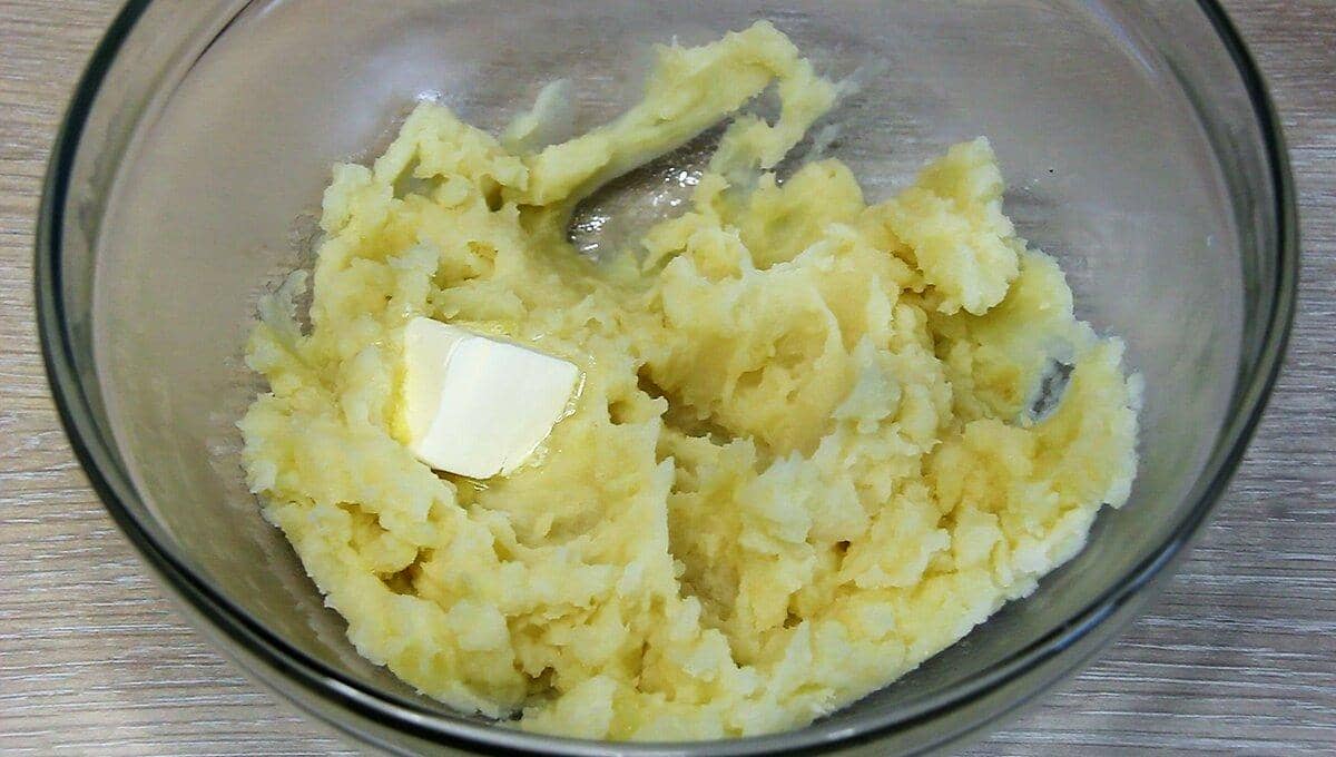 Для начинки очищену картоплю відваріть в підсоленій воді. Розтолочіть, щоб не було грудочок. Потім додайте вершкове масло, сире яйце.