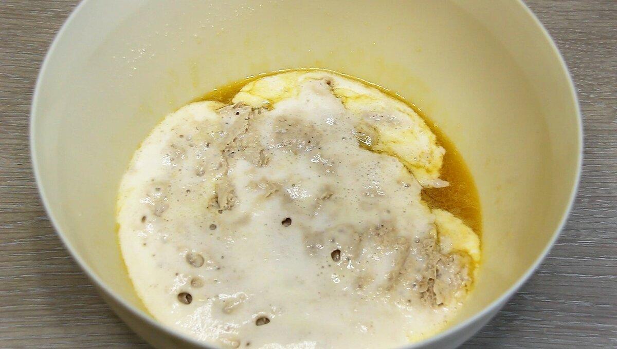 Спочатку потрібно приготувати опару. Для цього в тепле молоко додайте цукор, сухі дріжджі і борошно. Все перемішайте і залиште в теплі на 15 хвилин.