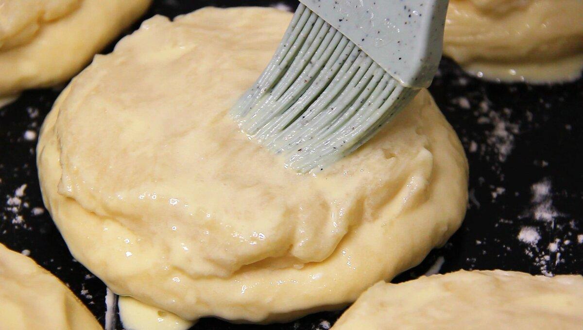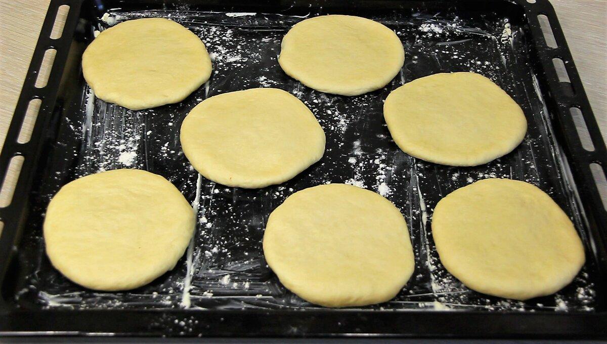 Підійшовше тісто обійміть, розділіть на кульки однакового розміру. Розкачайте кожну кульку в коржик і перенесіть заготовки на деко.