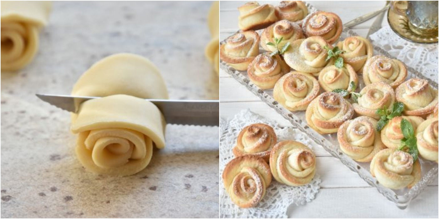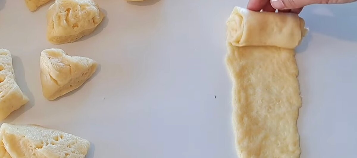 Розрізаємо тісто на маленькі шматочки. З двох шматочків руками формуємо тоненькі смужки і загортаємо в рулетики.