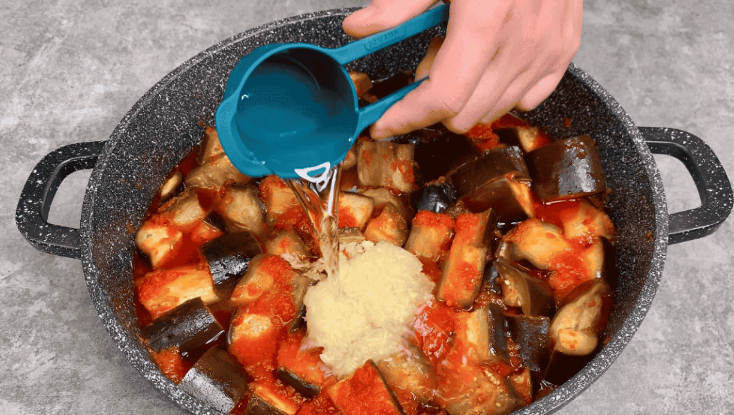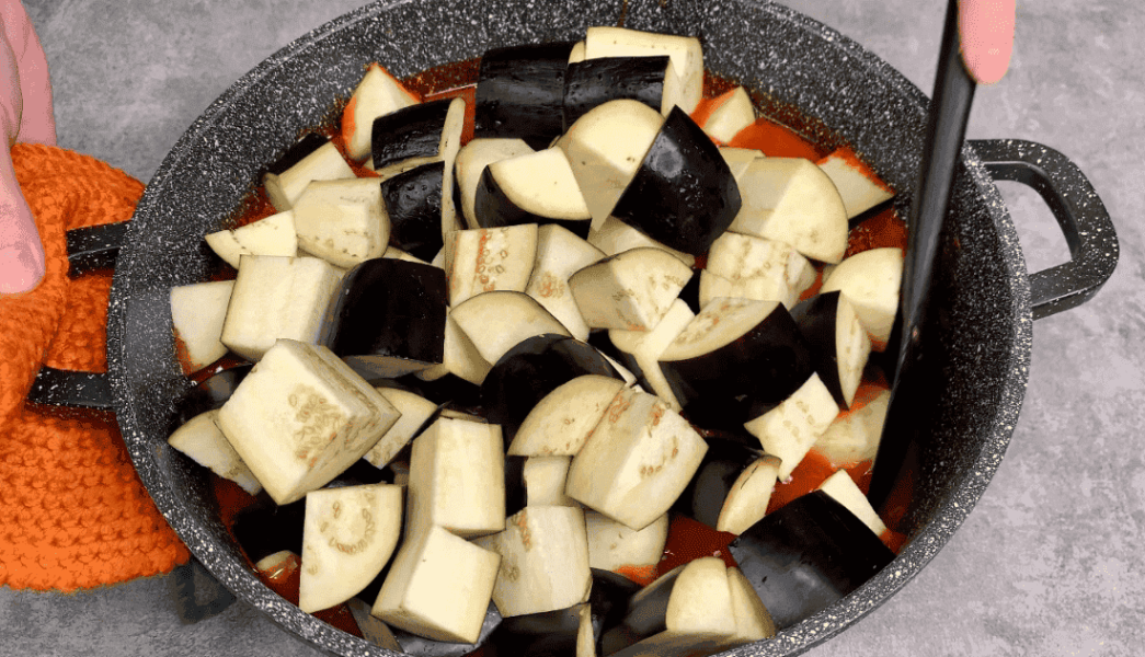 3. Додаємо нарізані великим кубиком баклажани.