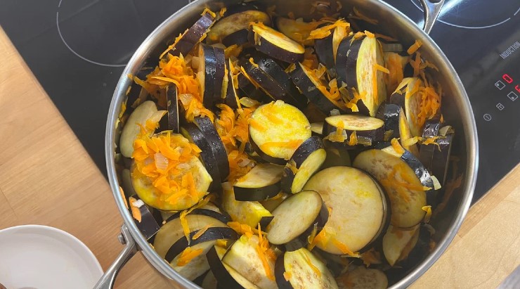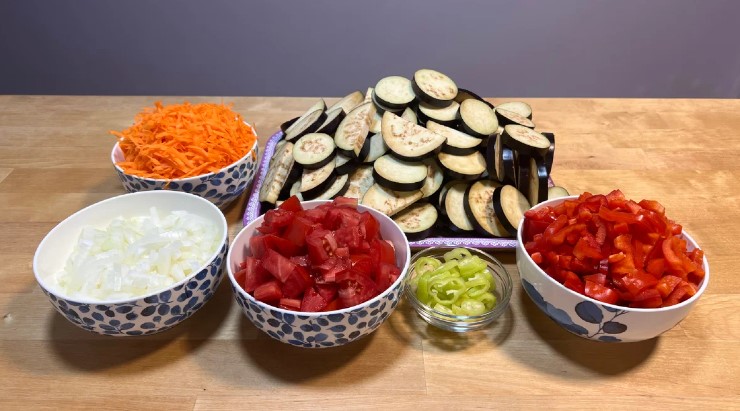 - Найскладніше це підготувати овочі. Баклажани нарізаю кільцями/напівкільцями товщиною близько 1 см. Моркву натираю на великій тертці, цибулю кубиками, перець соломкою, помідори просто невеликими шматочками.