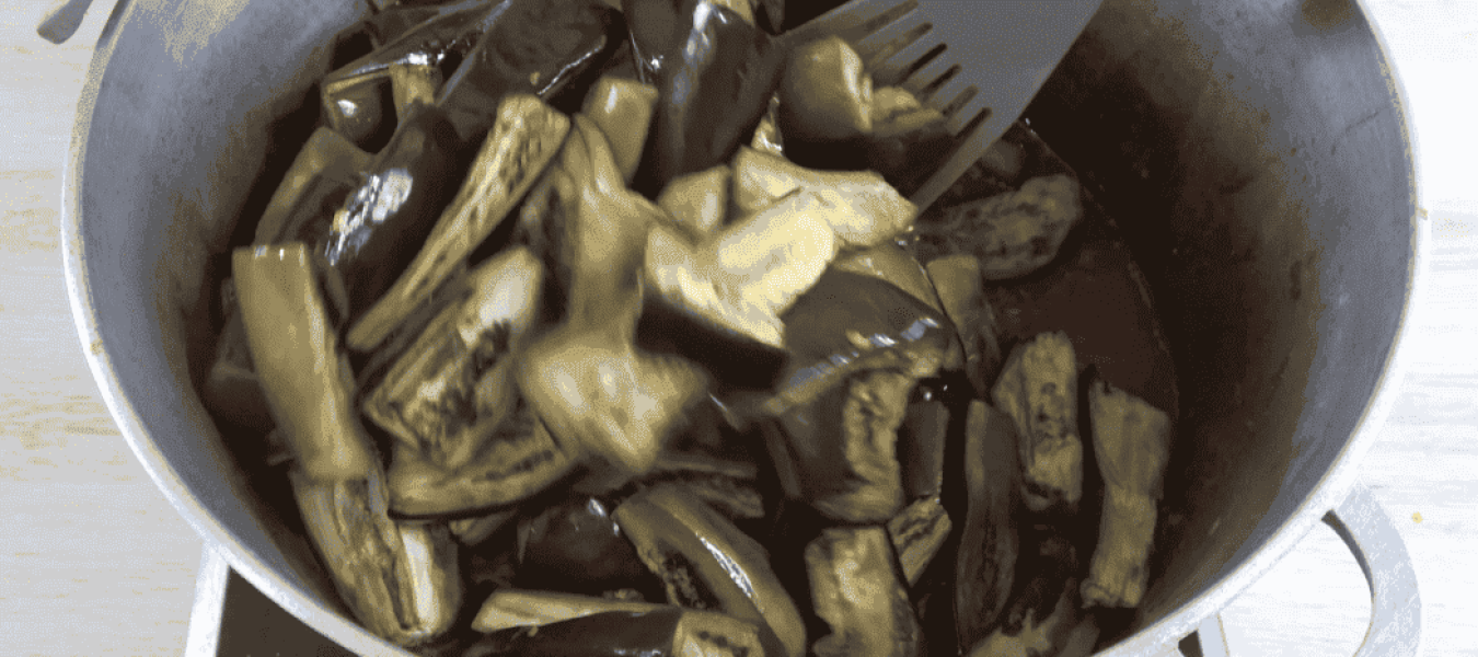 Коли баклажани готові (трохи підрум’янилися), виймаю їх із духовки. Вливаю в казан оцет і викладаю баклажани.
