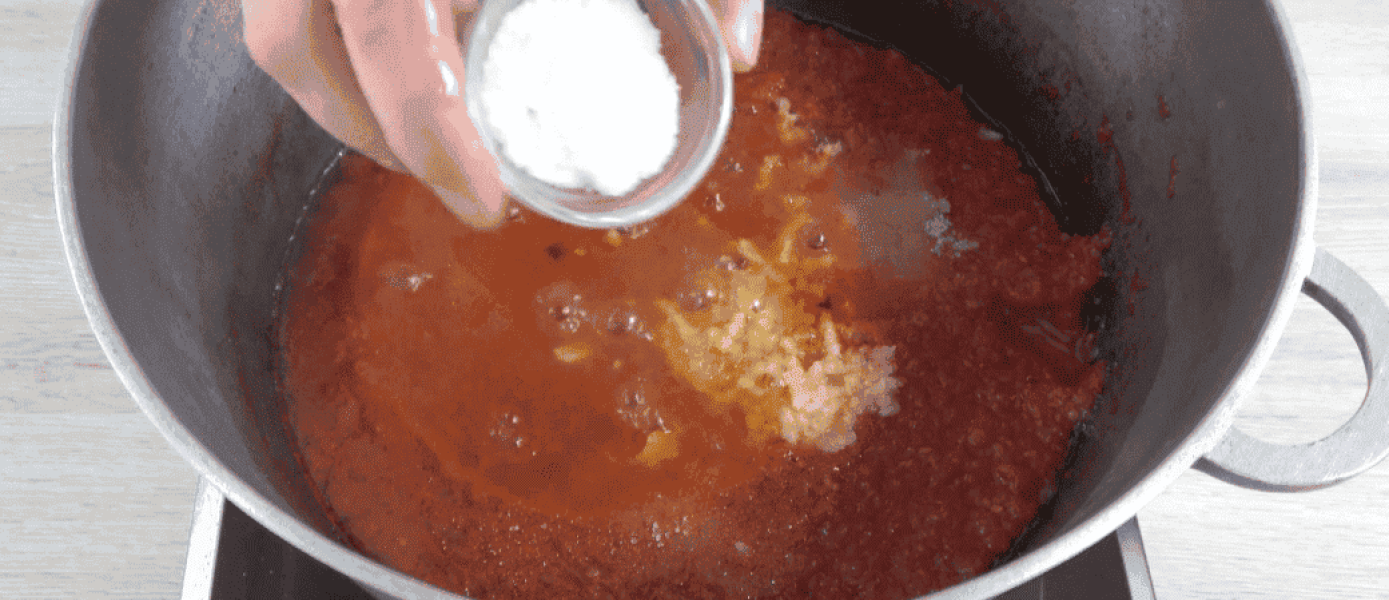 Томатна маса уварилася, видавлюю часник. Додаю сіль та цукор. Перемішую.