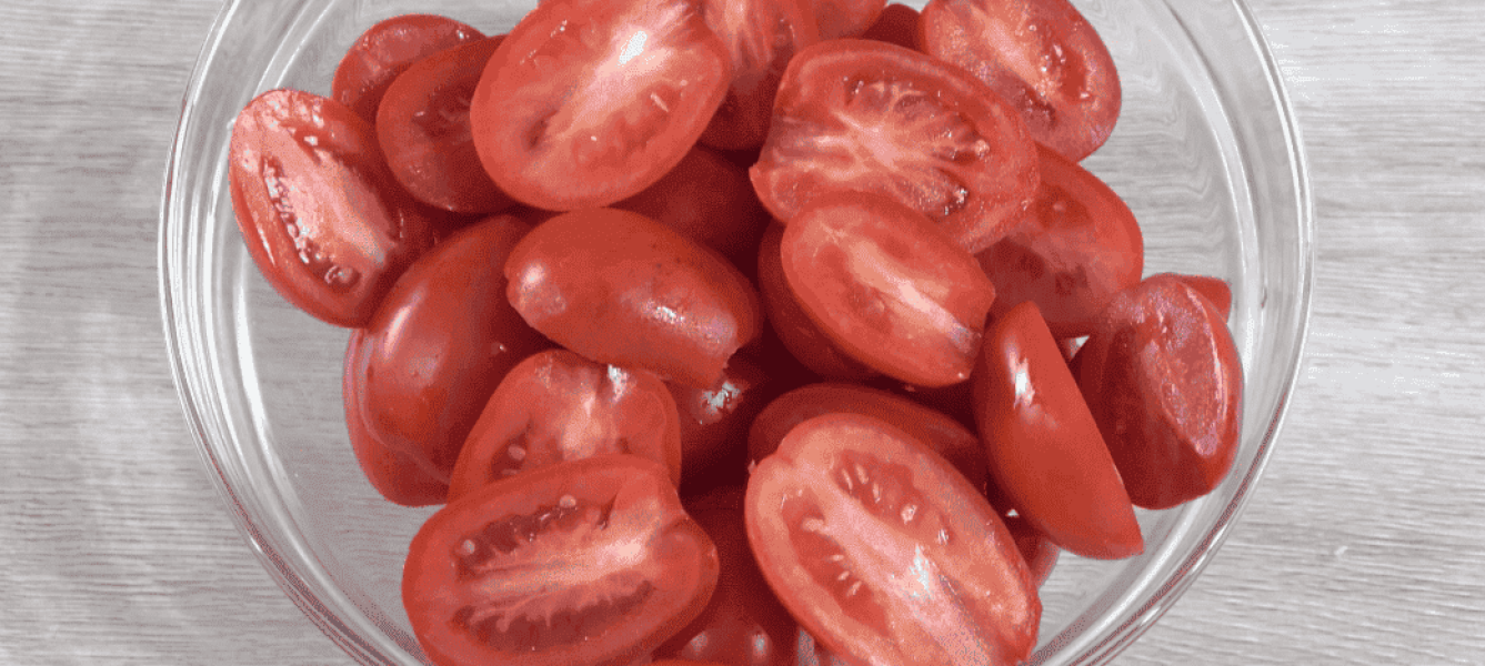 Помідори нарізаю навпіл. Намагаюся брати м’ясисті помідори, щоб баклажани не “плавали” в готовій страві.