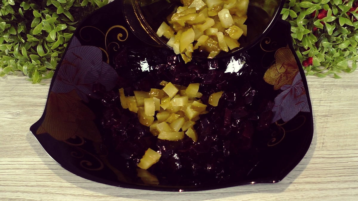 Додати мариновані, можна солоні огірки, їх беріть приблизно в половину менше, ніж буряка.