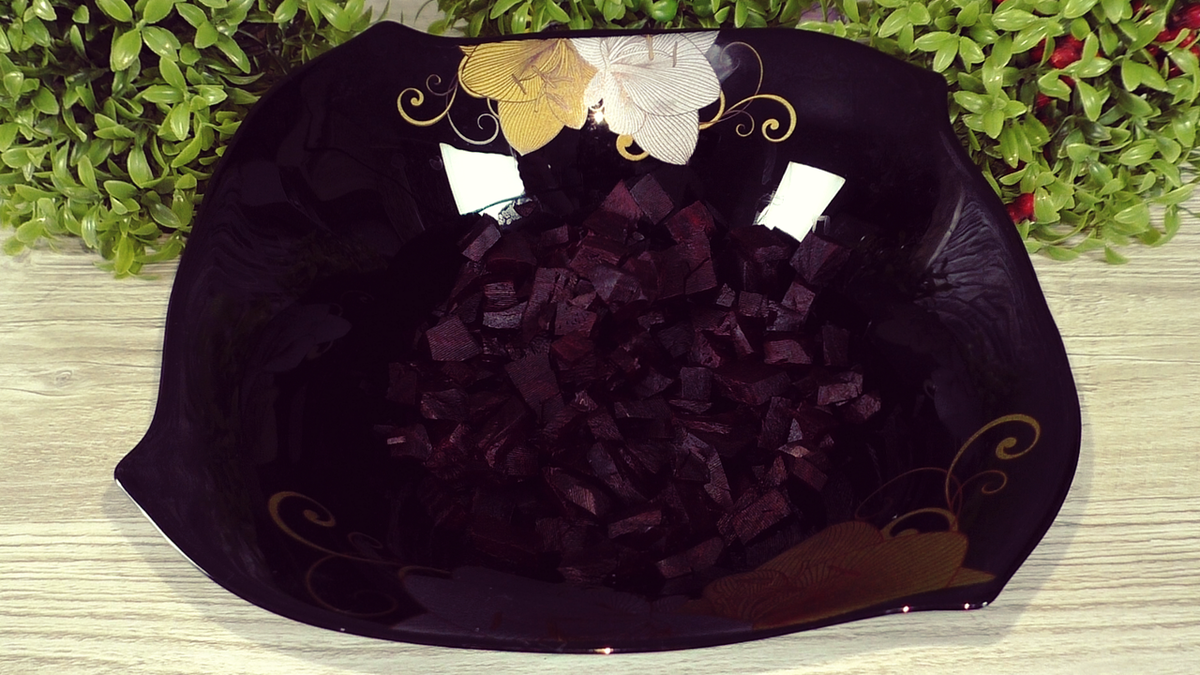 Буряк попередньо відварюємо до готовності. Для цього буряк миєму, кладемо в каструлю, заливаємо водою і ставимо на вогонь. Варимо буряк на середньому вогні приблизно 40 хвилин після закипання. Дістаємо буряк з відвару і даємо йому повністю охолонути.