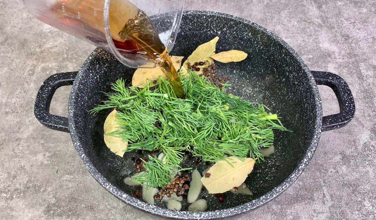 3. У каструлю з водою додаємо сіль, чорний перець горошком, лавровий лист, часник, зелень кропу або петрушки (що більше до смаку подобається).