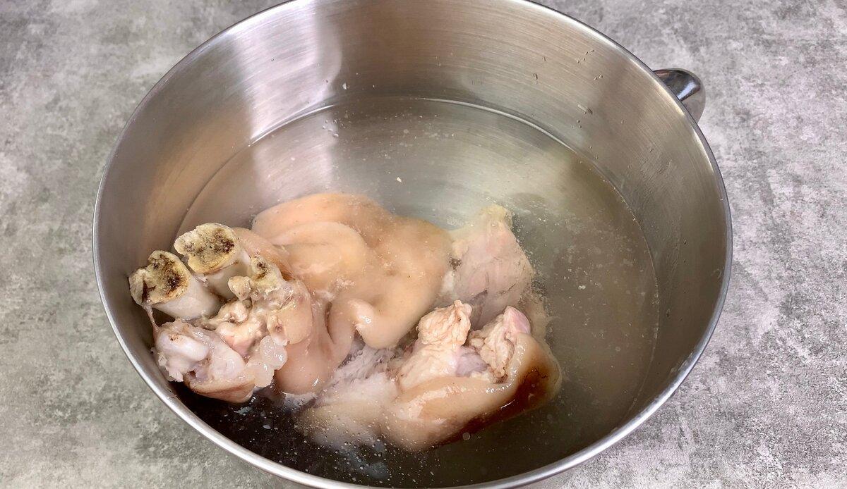 1. Свинячі ніжки відправляємо в каструлю, повністю заливаємо водою і варимо на середньому вогні 2 години після закипання.