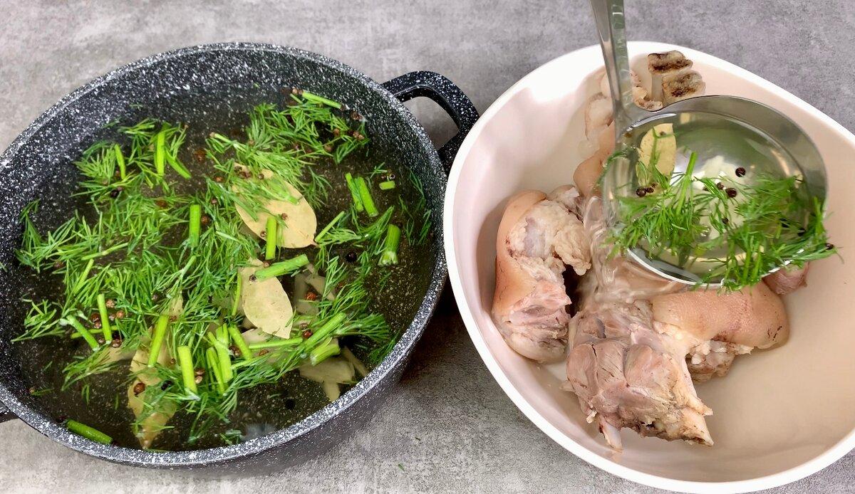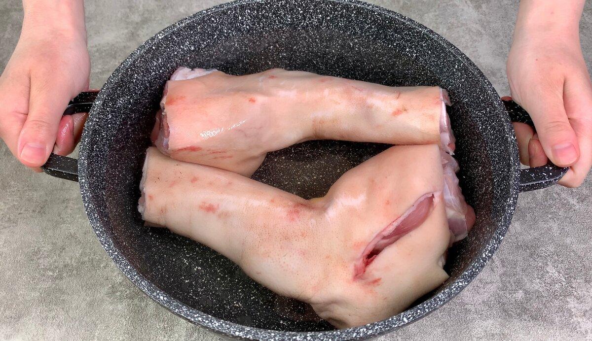 1. Свинячі ніжки відправляємо в каструлю, повністю заливаємо водою і варимо на середньому вогні 2 години після закипання.