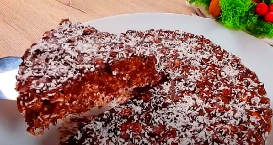 Суміш інгредієнтів переливаємо в тарілку та додаємо розтоплений темний шоколад. Зверху висипаємо пластівці. Перемішуємо все лопаткою.