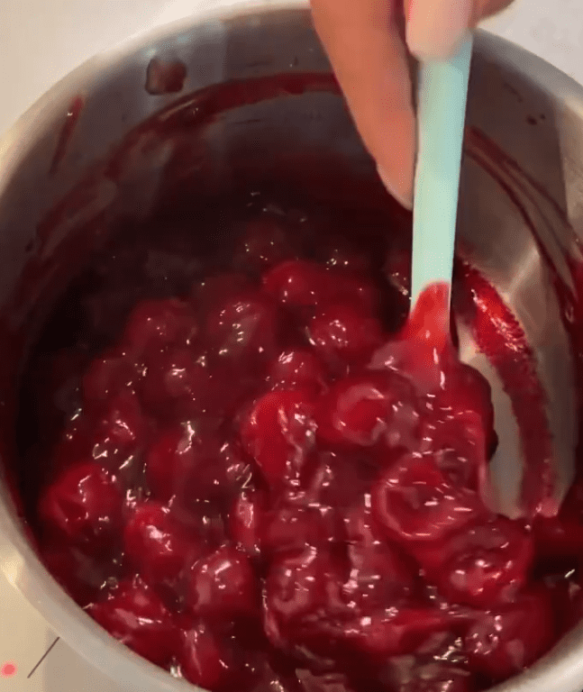 - Вишнева начинка: крохмаль змішати із водою до однорідної суміші. У сотейник покласти вишню із цукром. На середньому вогні довести до кипіння, потім додати розчинений крохмаль.