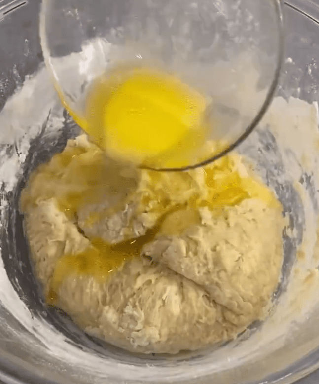 - Додати розм’якшене вершкове масло, вимішувати тісто.