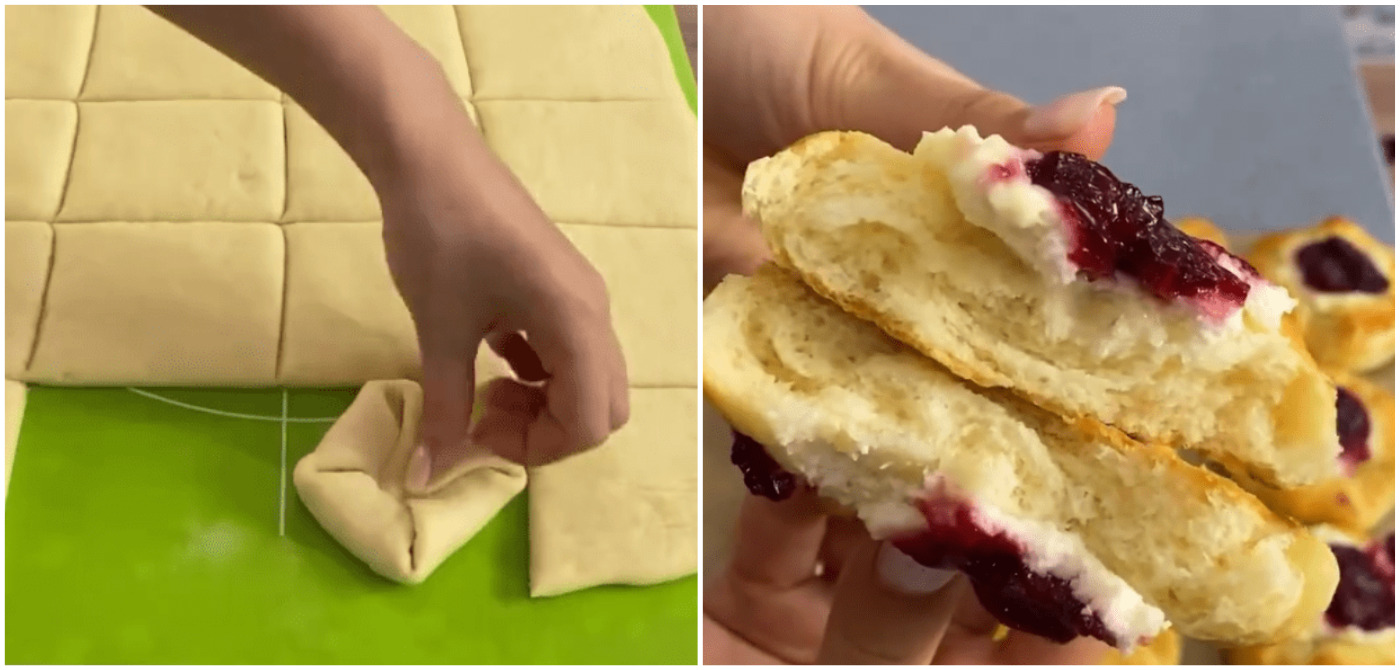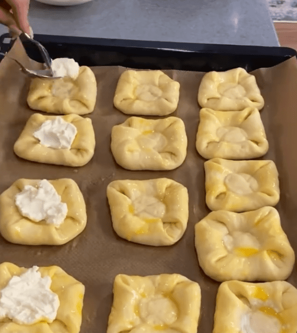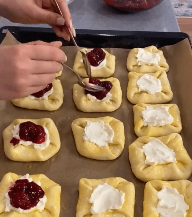 - Змастити яйцем, у кожну булочку покласти 1/2 ст. л. сирної начинки, потім зверху викласти вишневу начинку.