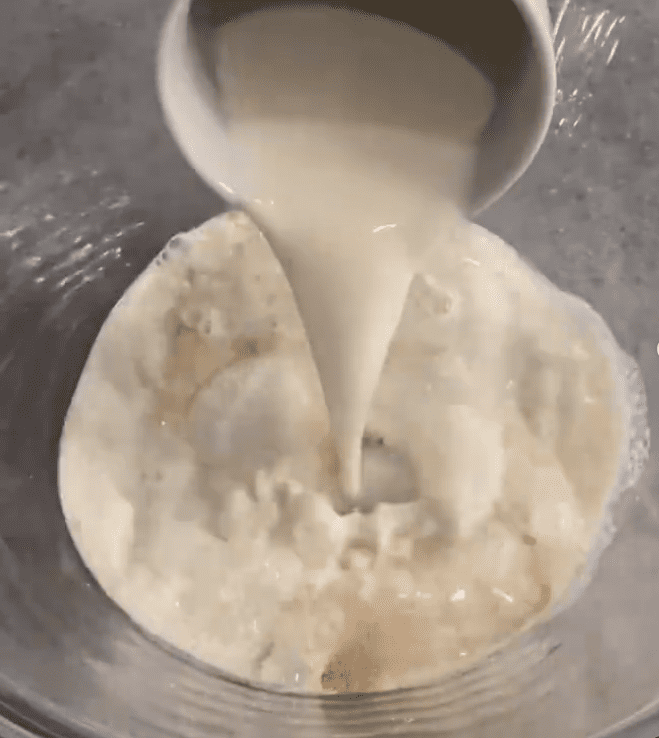 - З’єднати дріжджі, цукор, тепле молоко і перемішати до повного розчинення дріжджів. Додати яйця, перемішати до однорідної маси. Додати борошно і замісити тісто.