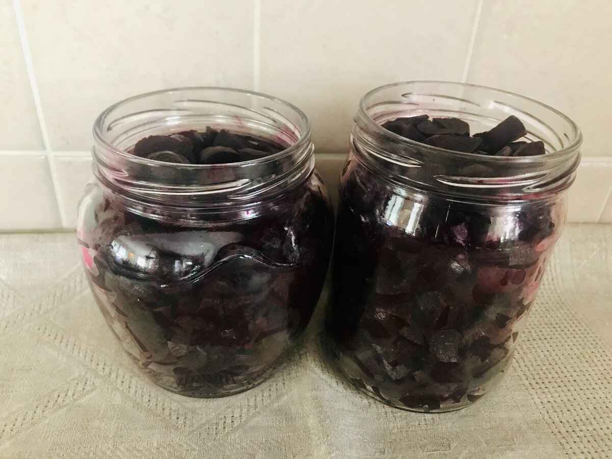 Банки для заготівлі заздалегідь стерилізую в духовці, а кришки кип’ячу. Нарізаний буряк розкладаю в підготовлені банки.