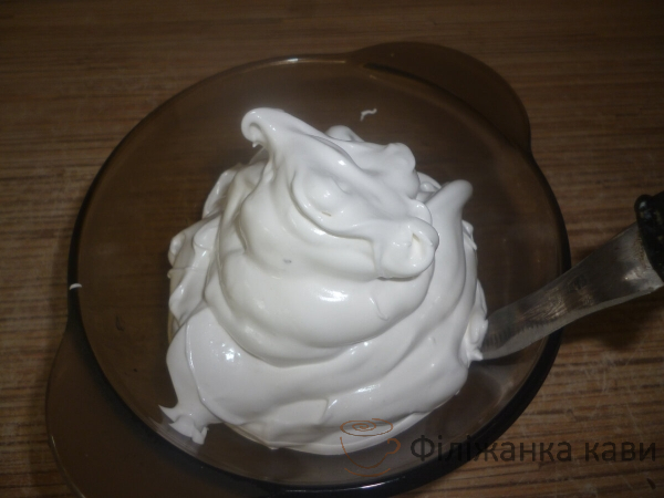 Беремо міксер, до білків додаємо крихітну дрібку солі і починаємо збивати їх. Потроху додаємо цукор з підмішаним до нього ваніліном.