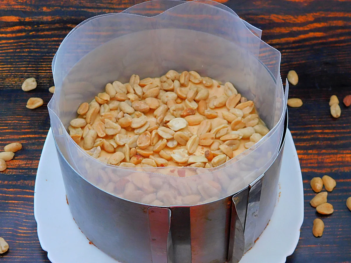 Прибрати торт Снікерс без випічки в холодильник на 4-6 годин для стабілізації та застигання.