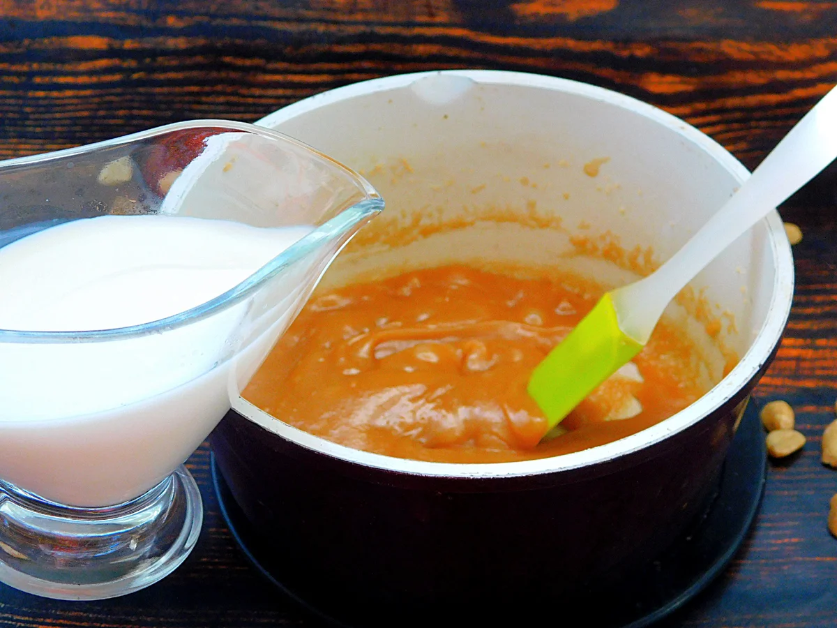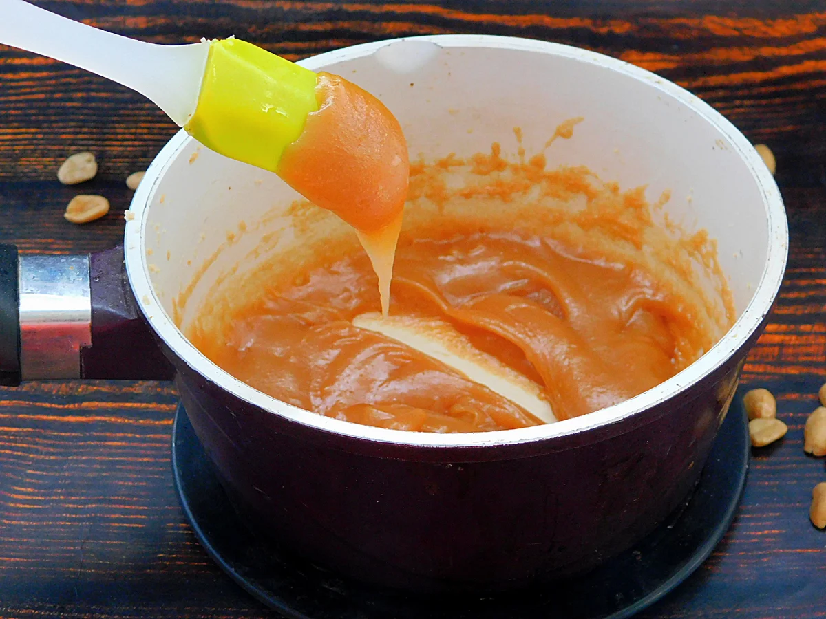 Смажити, постійно помішуючи, поки цукор не почне плавитися. Молоко закип’ятити та невеликими порціями ввести в карамель.