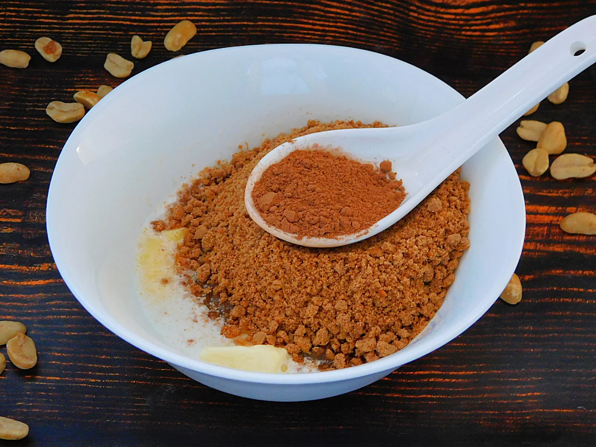 Для коржа пісочне печиво подрібнити у крихту будь-яким зручним способом. У мисці розтопити масло, додати пісочні крихти і какао.