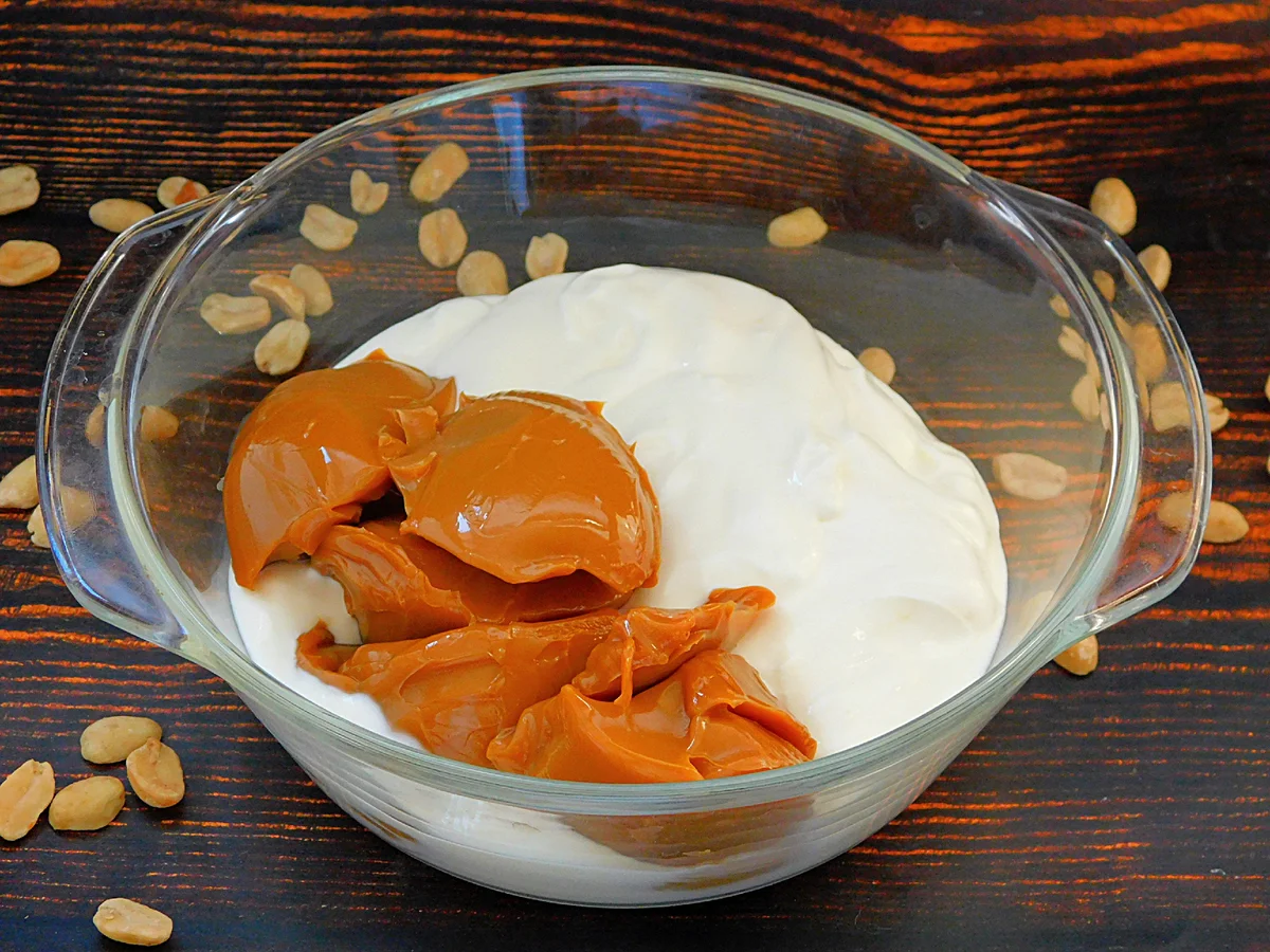 Для м’якого шару в миску викласти сметану та варене згущене молоко.
