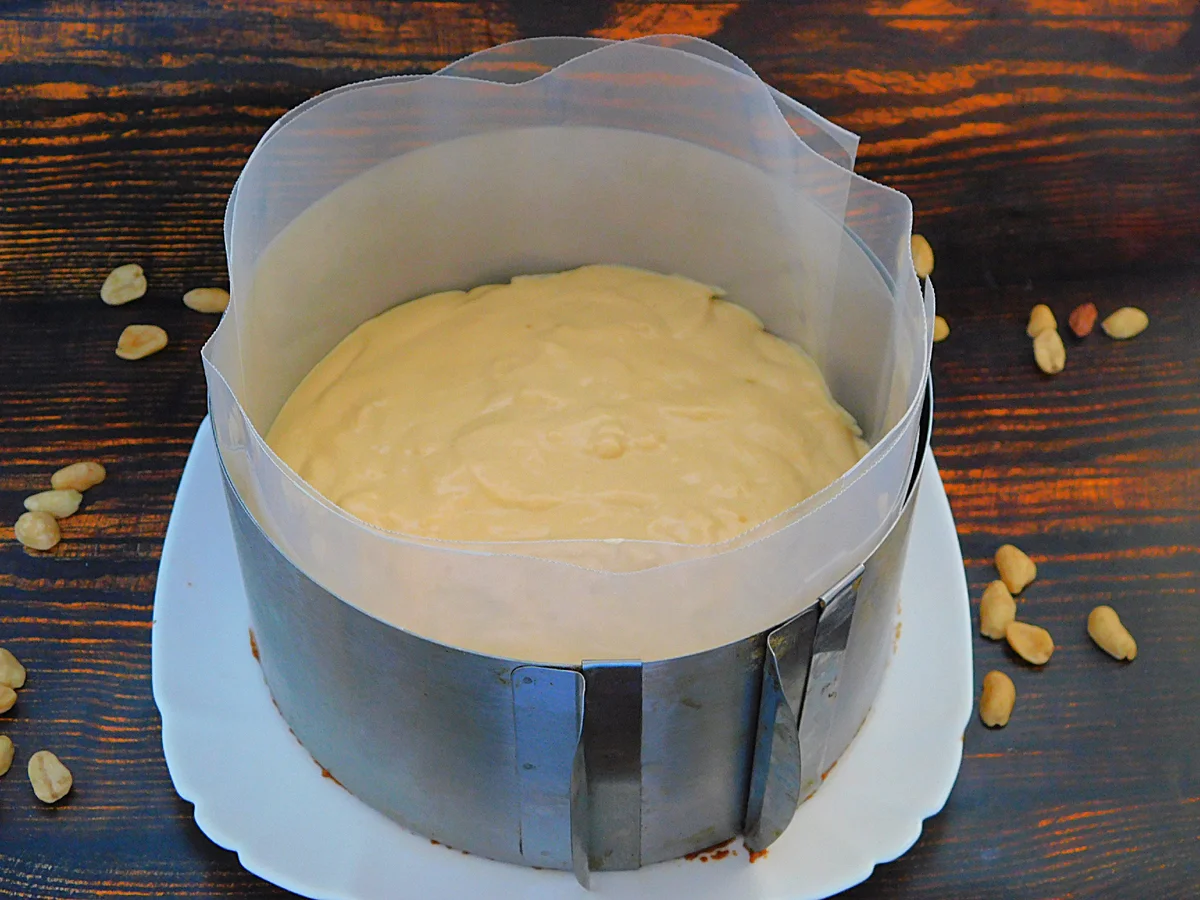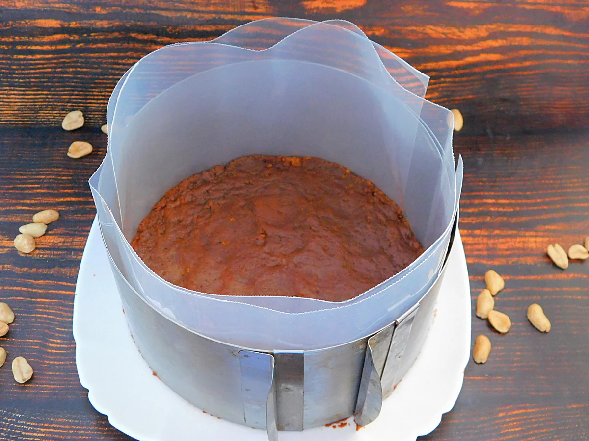 Бортики роз’ємної форми, у мене діаметр 17 см, прокласти щільним целофаном. На дно висипати печиво та утрамбувати ложкою або склянкою. Прибрати у холодильник.