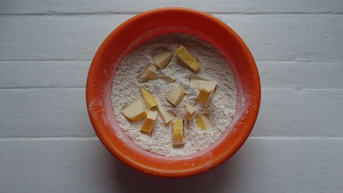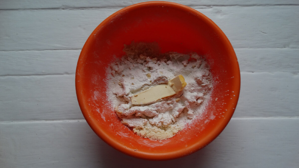У суху суміш вводимо розм’якшене вершкове масло ( решту: 2/3 ), нарізане на шматочки. Перетираємо борошно з маслом між долоньок до утворення крихт.