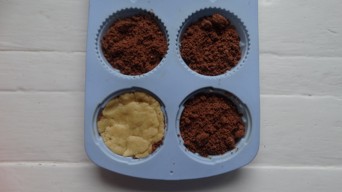 У шоколадне тісто теж додаємо масло ( залишилася додати половинку залишеного шматочка ). Тісто можна замісити, а можна знову перетерти між долоньками. Тільки тепер крихти вийдуть крупніше, і вони липнуть один до одного і до рук.