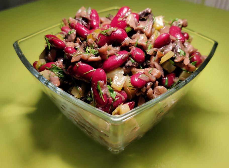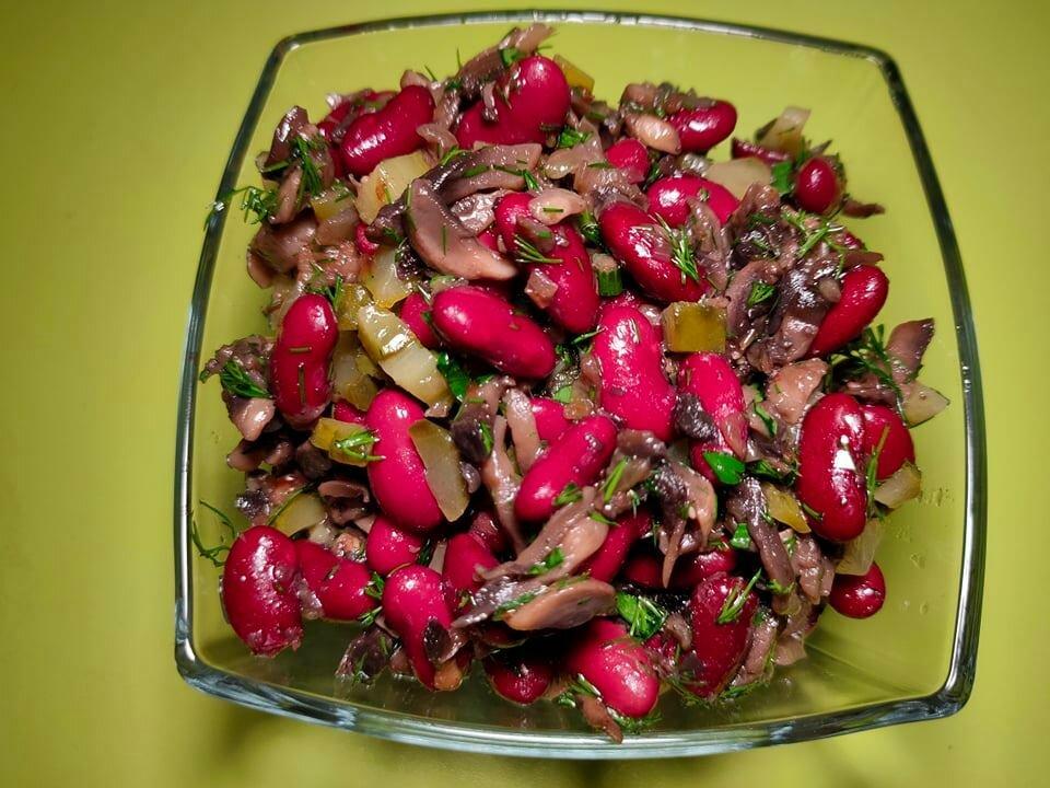В окрему чашу викладаємо готові, трохи охололі гриби з цибулею. Слідом викладаємо мариновані огірки, зелень і червону квасолю. Пробуємо на сіль і досолюємо салат за смаком. Заправляємо оливковою або соняшниковою олією. Все гарненько перемішуємо. Салат готовий – смачного Вам!