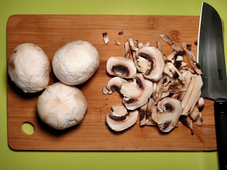 Печериці промиваємо і некрупно нарізаємо.