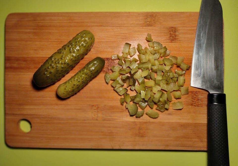 Нарізаємо мариновані огірки дрібними кубиками.