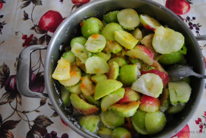Залишимо постояти хвилин на 30. За цей час яблука трохи пустять сік – ставимо на повільний вогонь. Чекаємо, поки розчиниться цукор, доводимо до кипіння, вимикаємо.