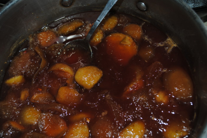 Через 2 години знову ставимо на вогонь, додаємо апельсинову цедру, паличку кориці (можна замінити на мелену, 1 ст. ложка) і гвоздику. Кип’ятимо, охолоджуємо і повторюємо процедуру втретє.