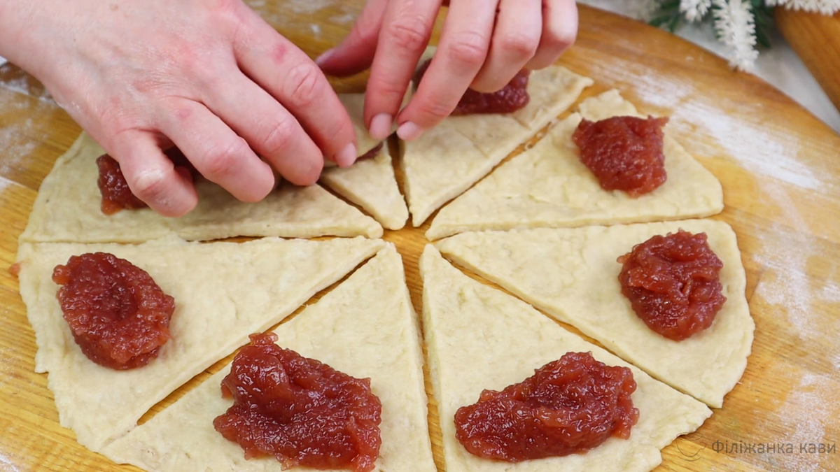 Додаємо повидло, густе варення або джем і закручуємо в рогалик.