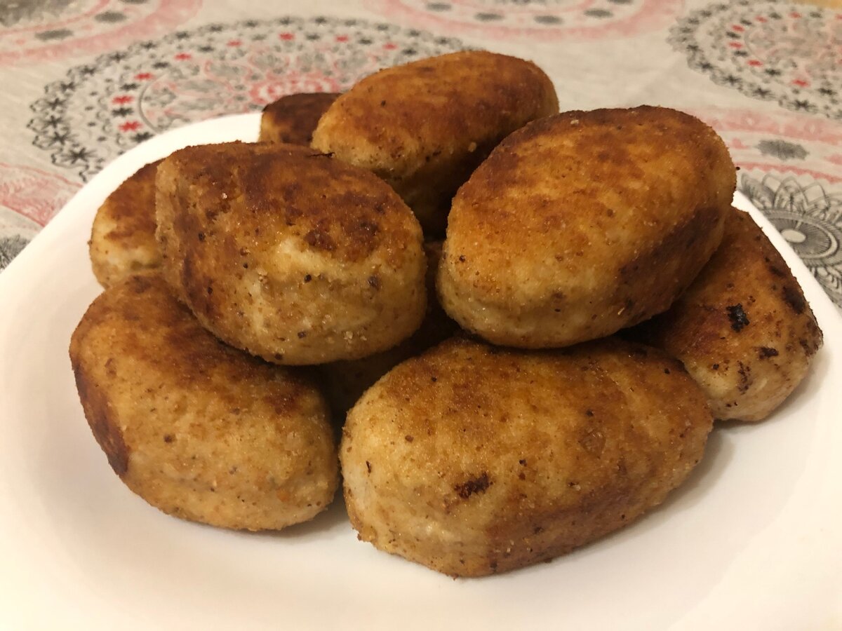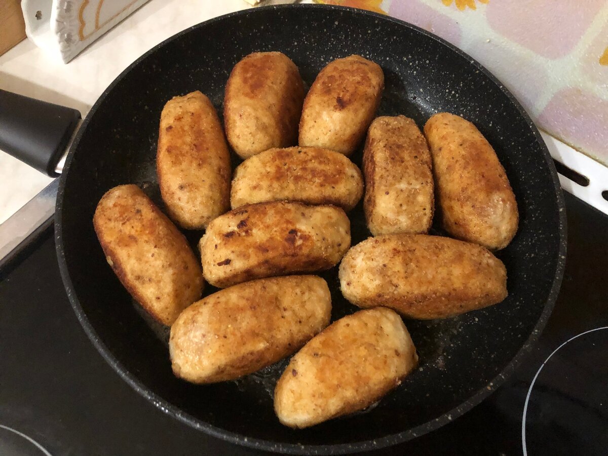 - Підготовлені напівфабрикати (у мене вийшло 11 штук) викладаємо на сковороду з розігрітою олією і обсмажуємо на невеликому вогні (щоб панірування не згоріло, і всередині котлети пропеклися) з усіх боків до золотистого кольору.