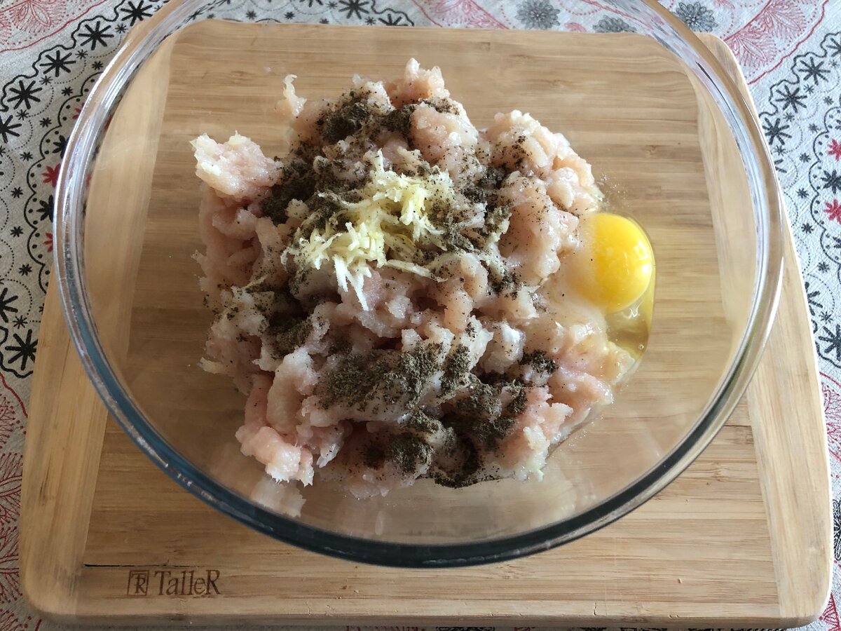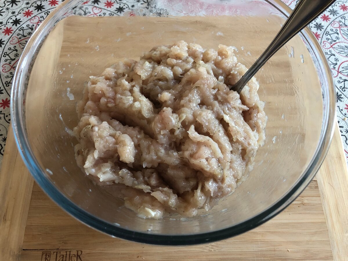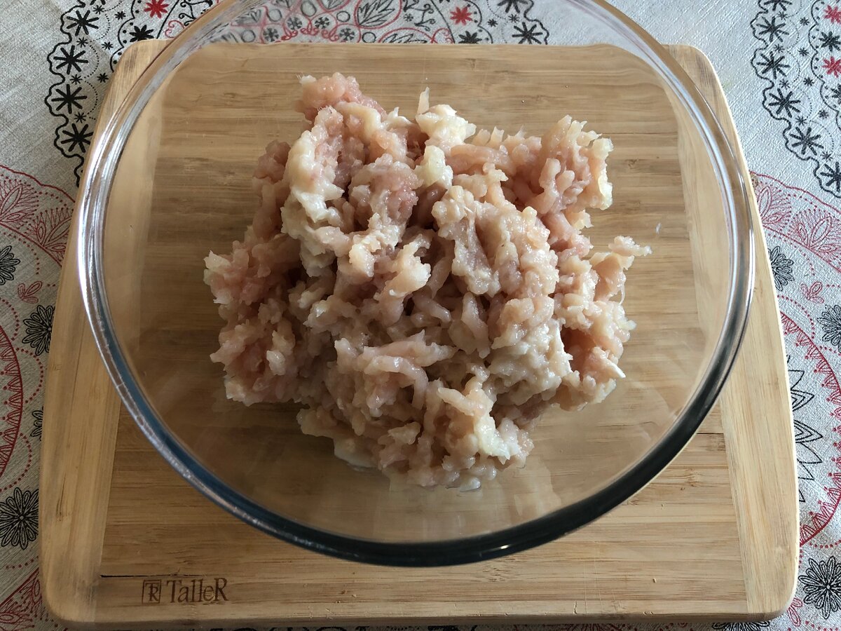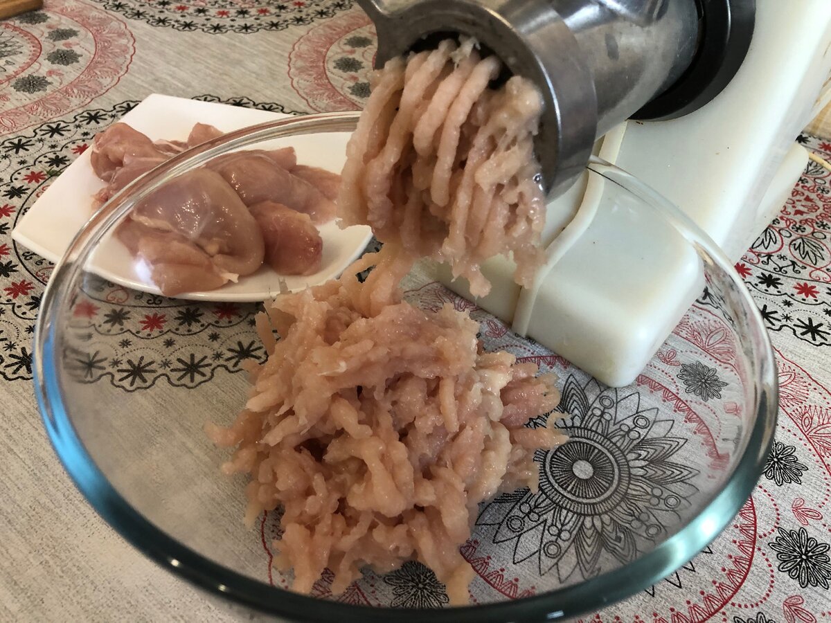 - Куряче філе і цибулину прокручуємо на м’ясорубці.