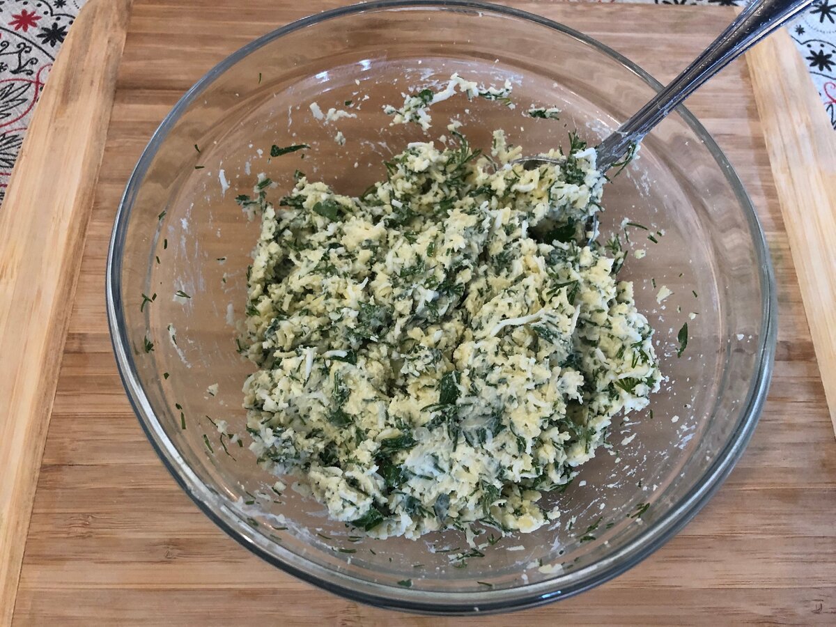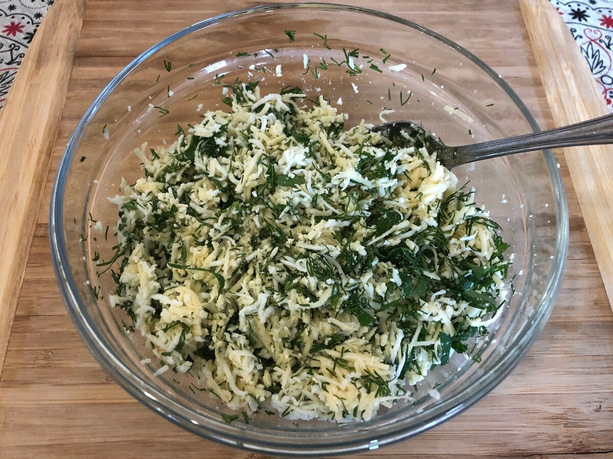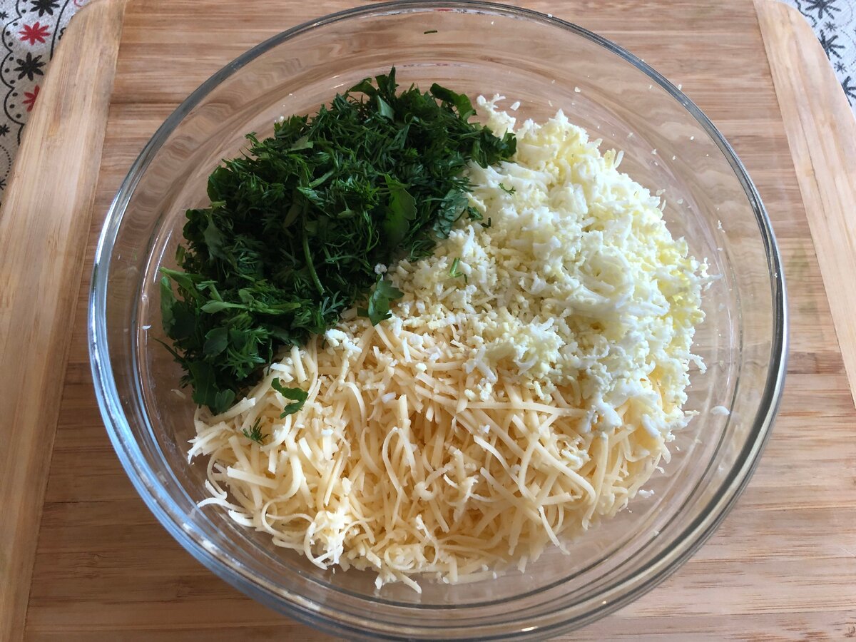 - Сир натираємо на дрібній терці. Зварені круто яйця також натираємо на дрібній терці. Кріп і петрушку дрібно нарубати.