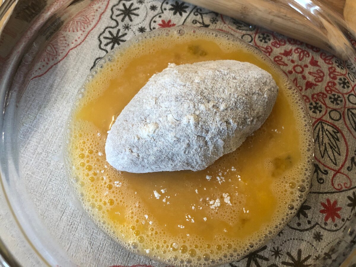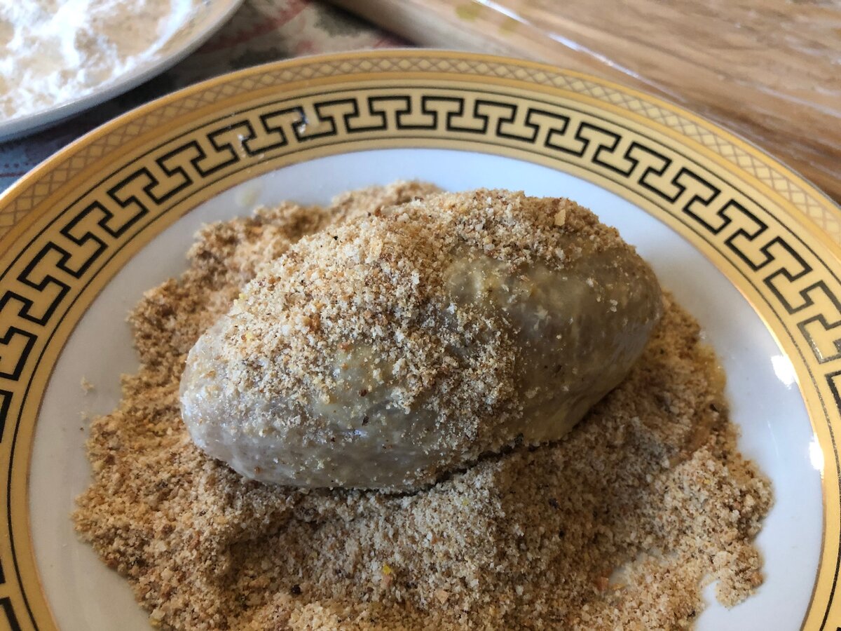 - Підготуємо тарілочку з борошном і панірувальними сухарями.