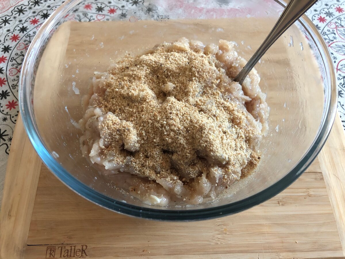 - Додаємо 2 – 3 ст. л. панірувальних сухарів, щоб фарш став більш пластичним. Вимішуємо до однорідного стану.