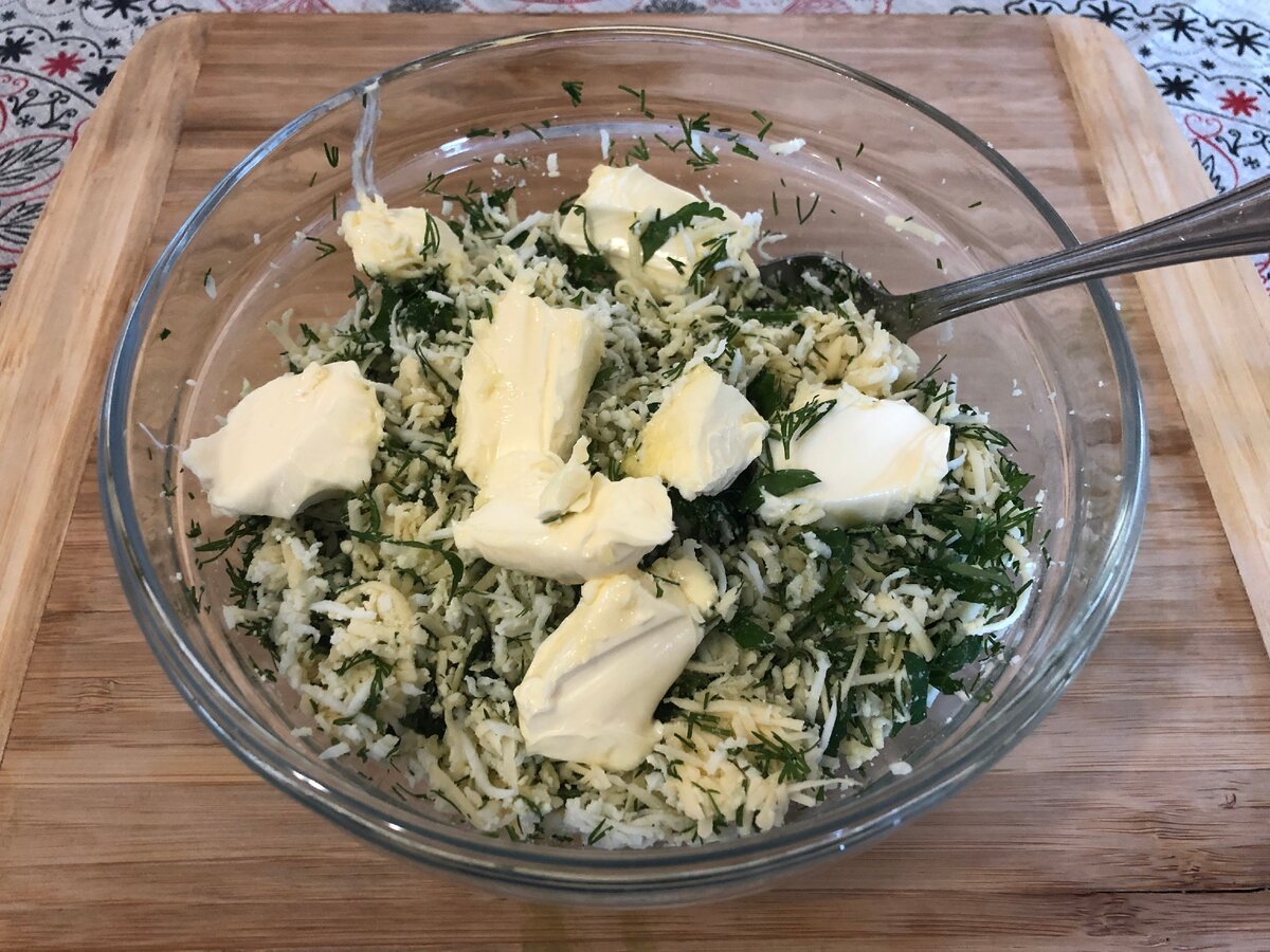 - Додаємо шматочки розм’якшеного вершкового масла (його необхідно буде дістати заздалегідь з холодильника) і ще раз добре вимішуємо. Посолити за смаком.