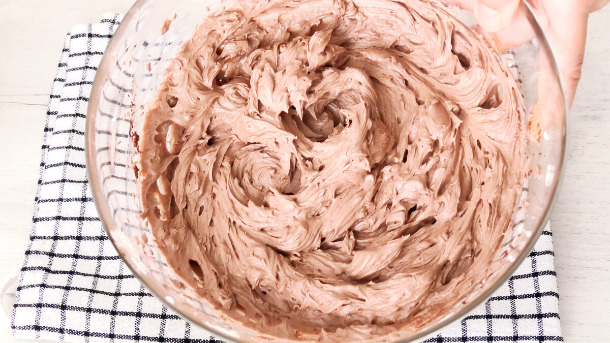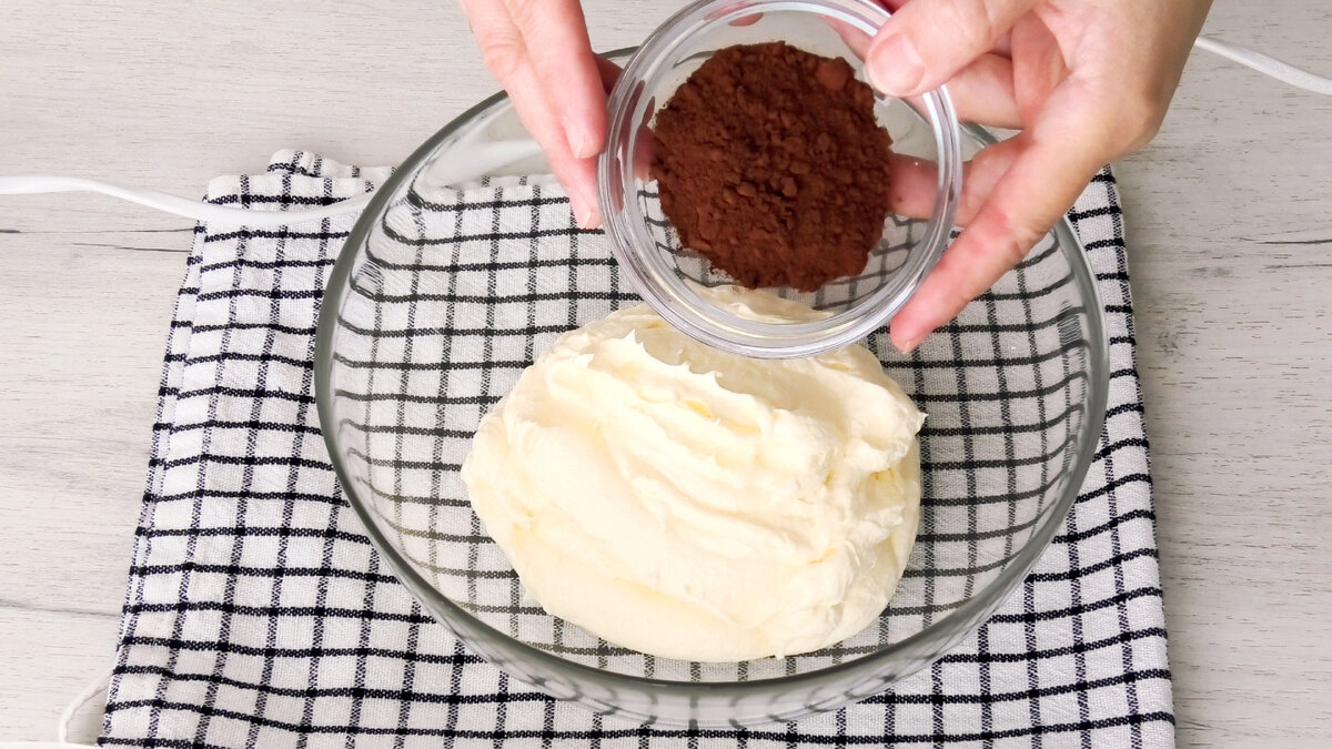 Частину крему відкласти в іншу миску, додати какао і добре збити.